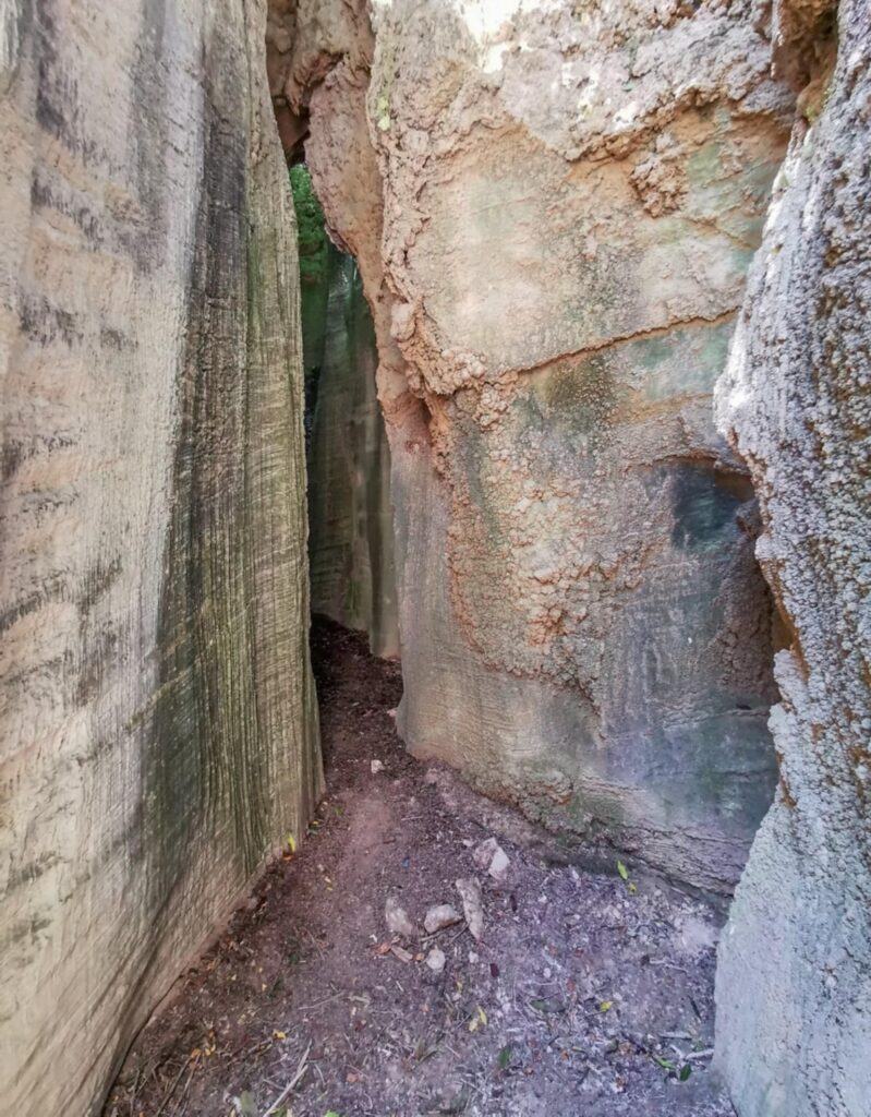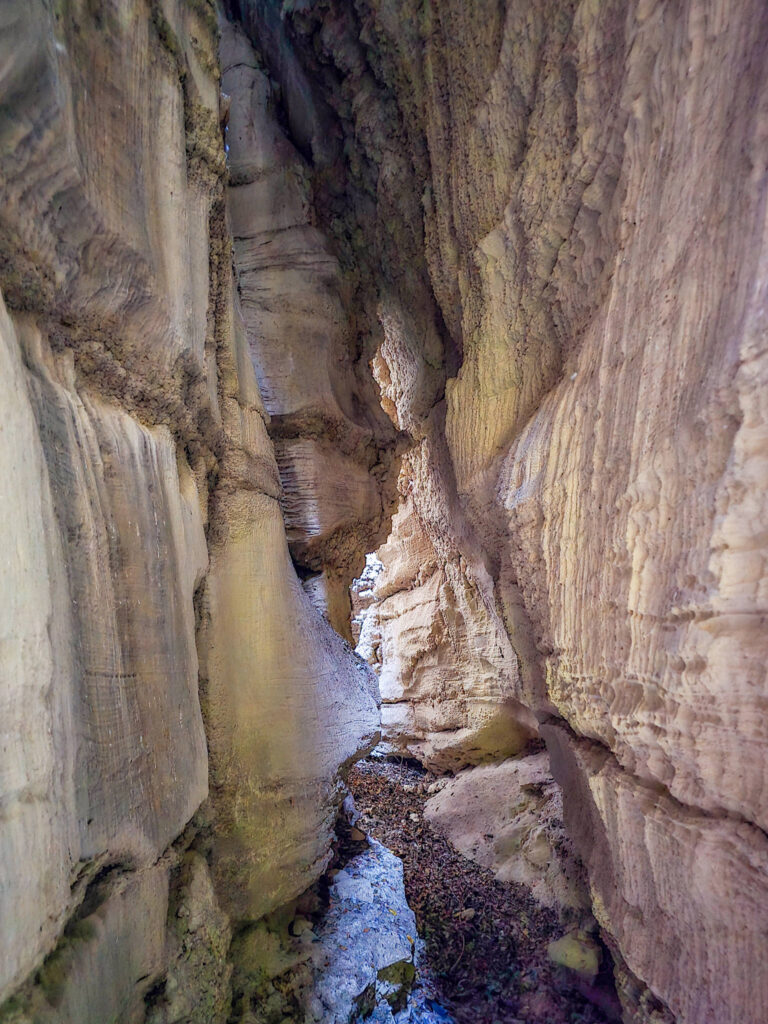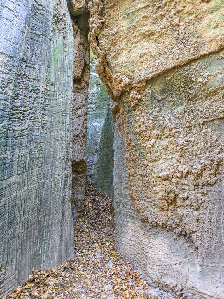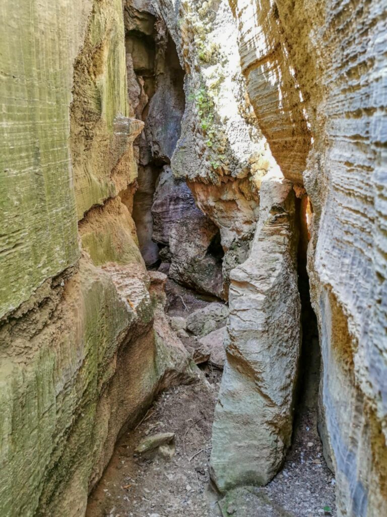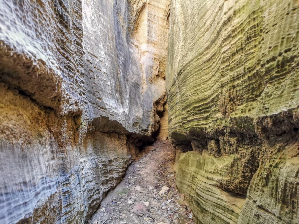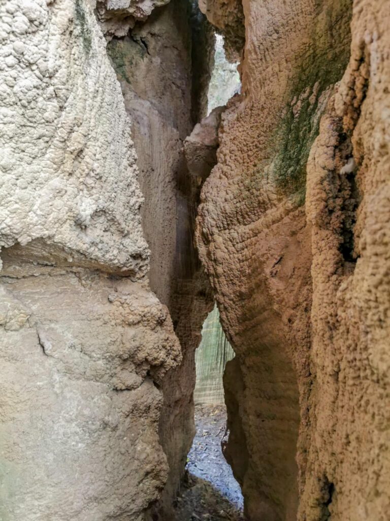 Ένα στενό πέρασμα σαν μυστική πύλη οδηγεί σε στενό διάδρομο ανάμεσα σε ψηλά κάθετα πρανή, τα οποία είναι διακοσμημένα με αιωνόβια ανάγλυφα μωσαϊκά. Με την άρτια συμμετρία και την μοναδική τους υφή τα πέτρινα αυτά γλυπτά θυμίζουν κεντήματα της φύσης.