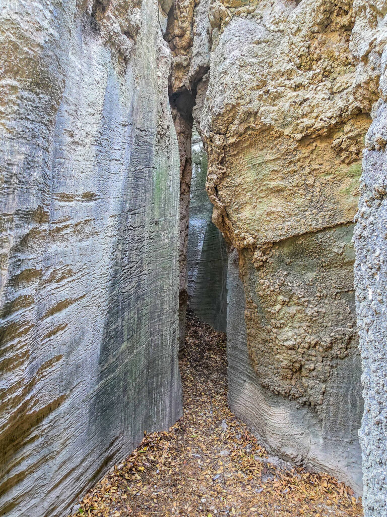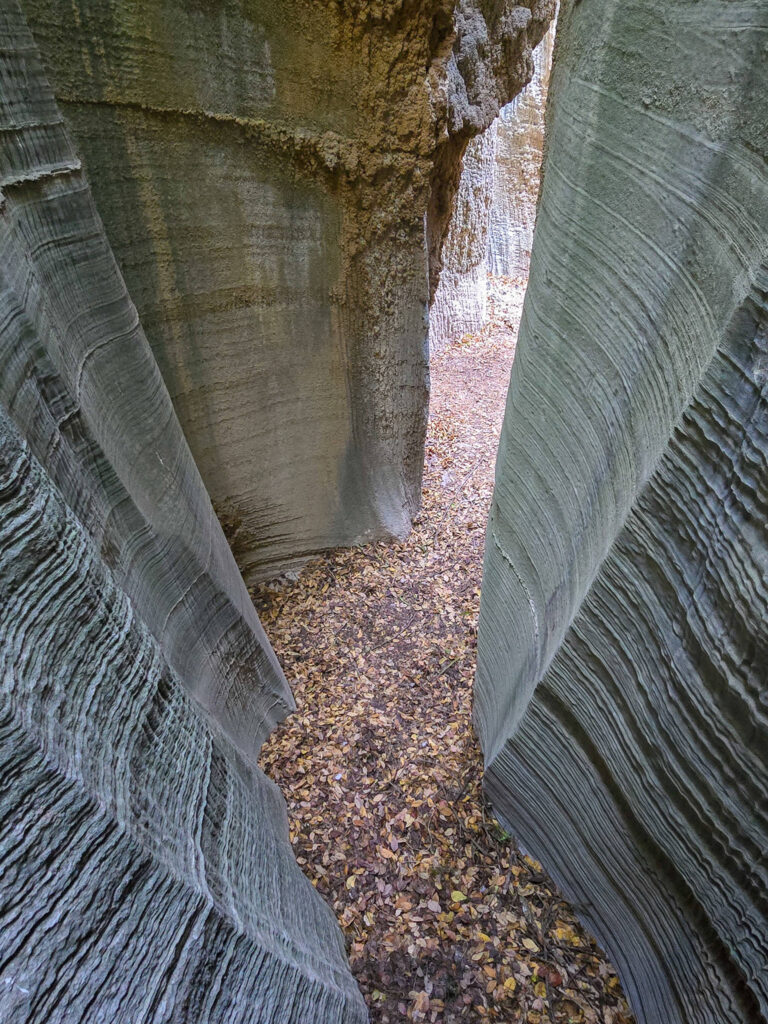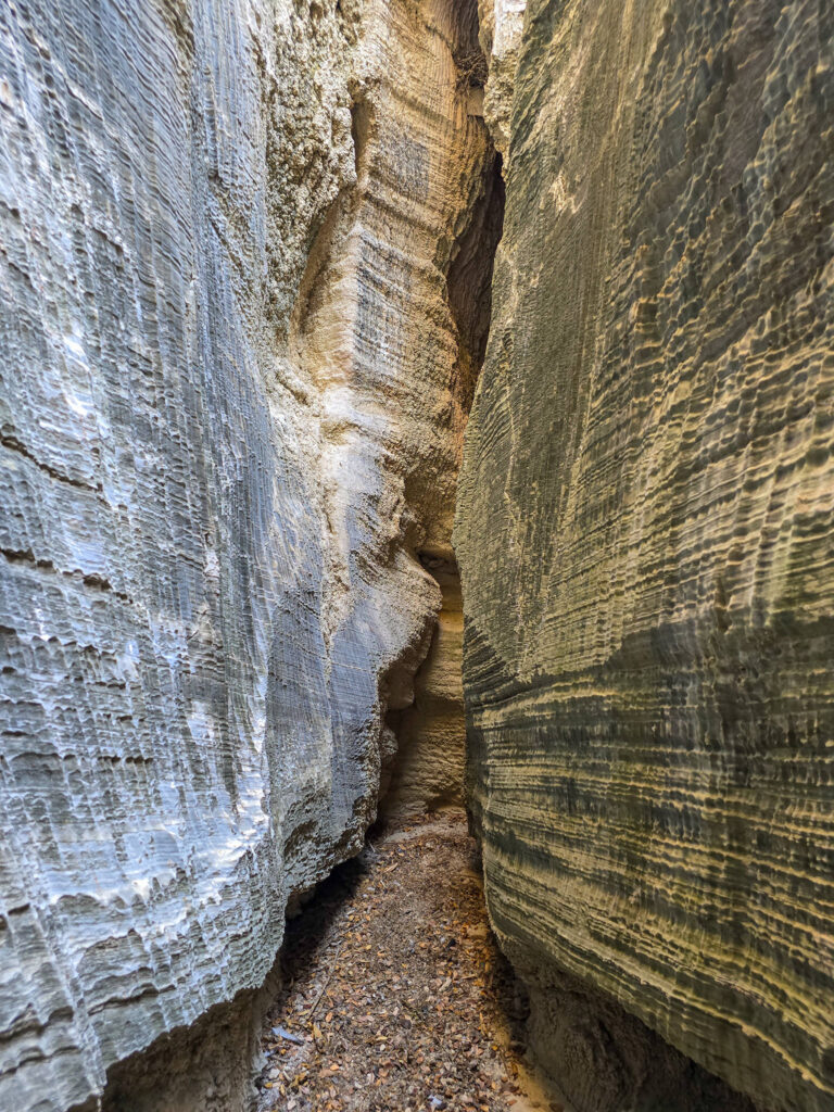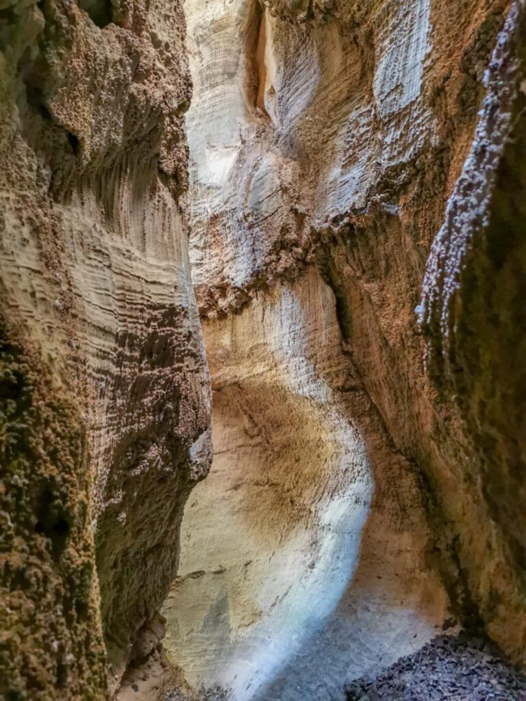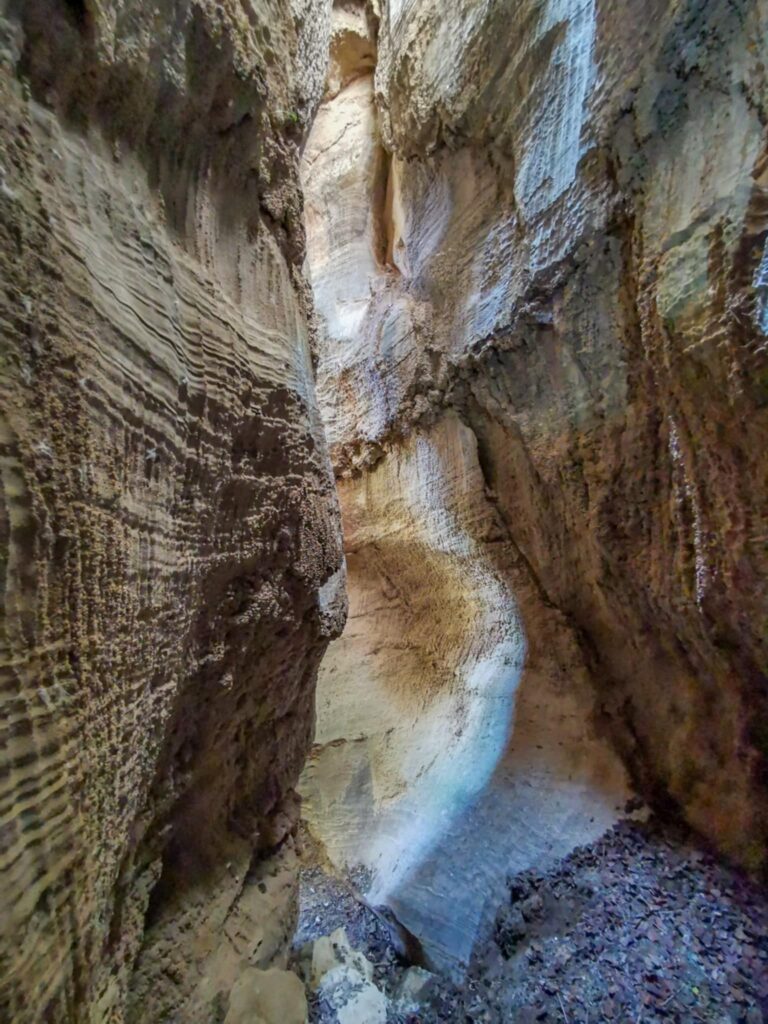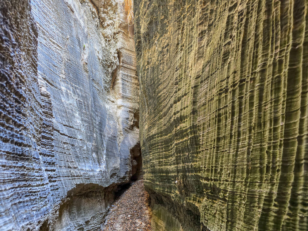 Ένα στενό πέρασμα σαν μυστική πύλη οδηγεί σε στενό διάδρομο ανάμεσα σε ψηλά κάθετα πρανή, τα οποία είναι διακοσμημένα με αιωνόβια ανάγλυφα μωσαϊκά. Με την άρτια συμμετρία και την μοναδική τους υφή τα πέτρινα αυτά γλυπτά θυμίζουν κεντήματα της φύσης.